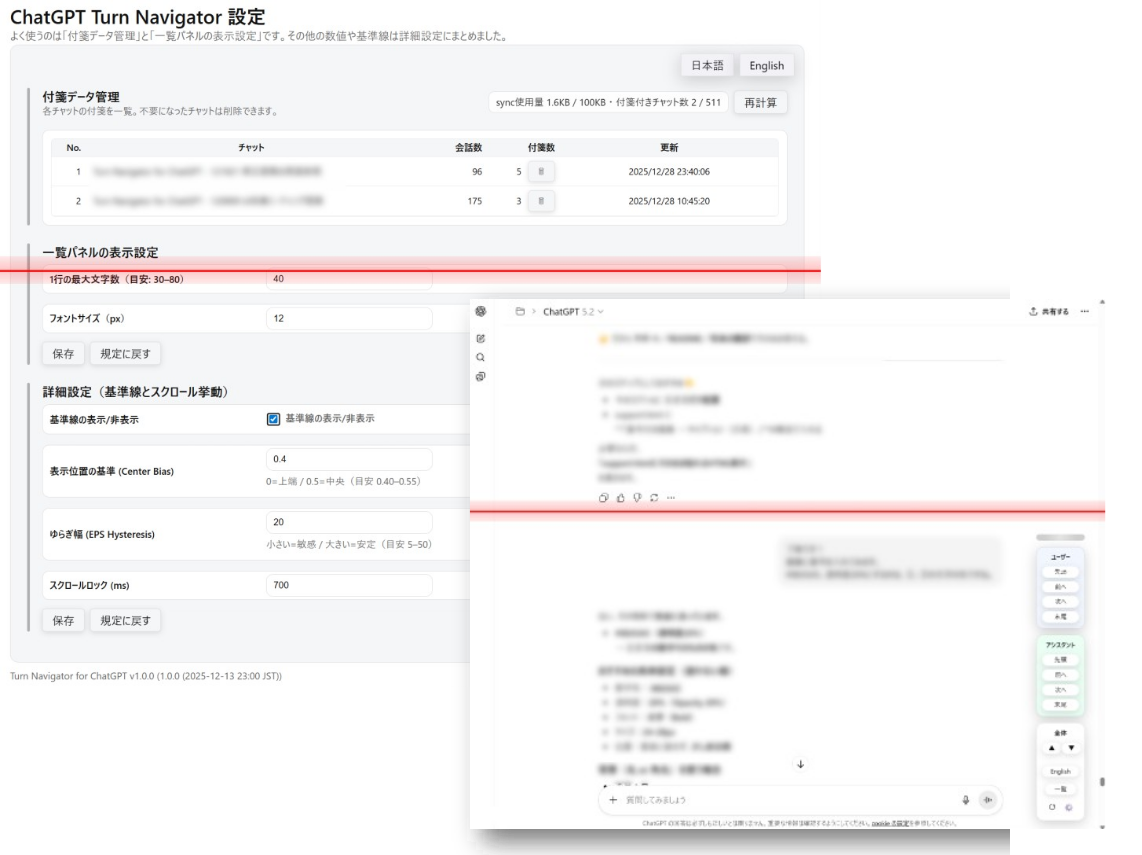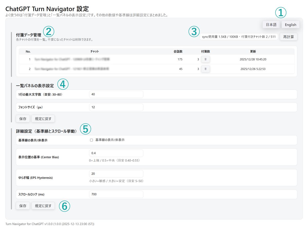 ①Language switch ②Pin data manager (delete per chat) ③Sync usage / Recalculate ④List settings (max chars, font size,