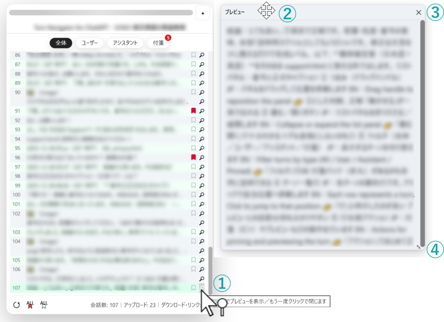 ①Drag handle ②Collapse / Expand ③Filter (All / User / Assistant /